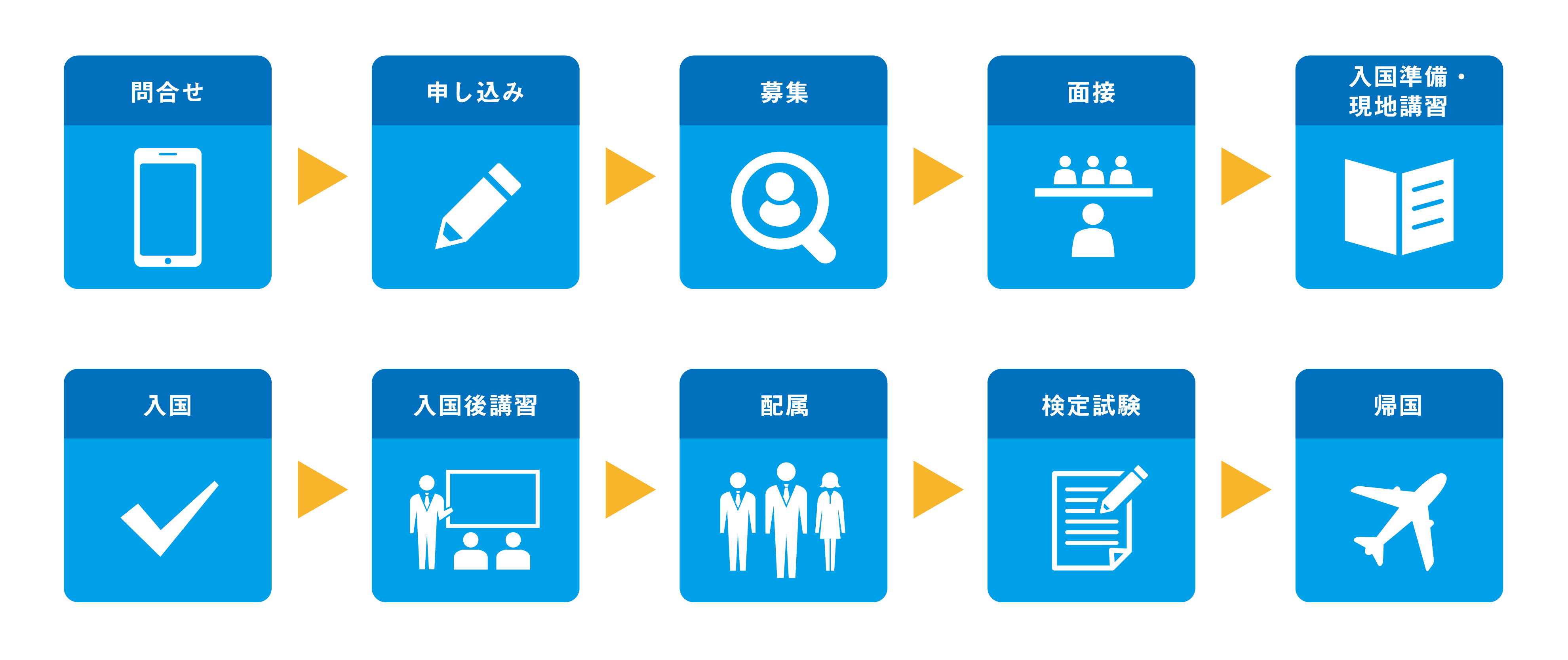 申し込みいただいてから約7ヶ月で企業様に配属されます。配属初日には、当組合スタッフが技能実習生と共に企業様に伺わせていただきます。実際のスタートは配属からになりますが、引き続き企業様と技能実習生をサポートさせていただきます。